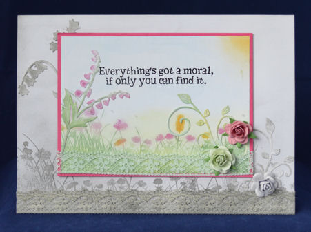 I love the IndigoBlu nature stamps, and reach for them constantly when stamping. This poppy meadow background stamp is just gorgeous. The scene is coloured with pan pastels, stamped in versamark and the ink rubbed with more pan pastels to get a soft, colouring effect. Diecuts and the grey lace are also coloured with pan pastels. The soft green lace is the colour that it was when my good friend Lee gave it to me - she scored some real vintage lace, and it's wonderful stuff!! Thanks Lee :-)