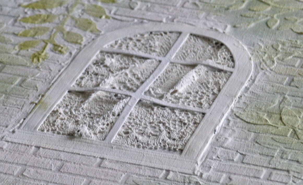 This window uses a diecut from white card with lace stuck on behind the diecut, and the whole thing is covered with a layer of white gesso.